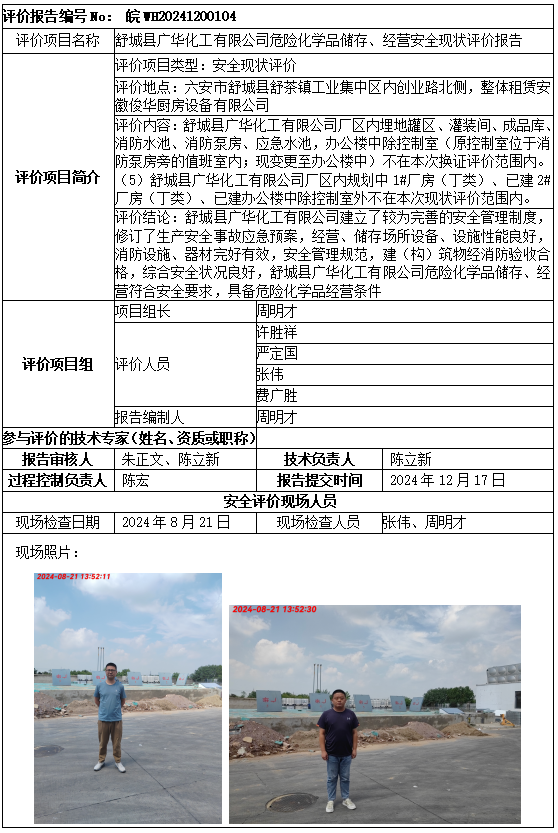 舒城县广华化工有限公司危险化学品储存、经营安全现状评价报告