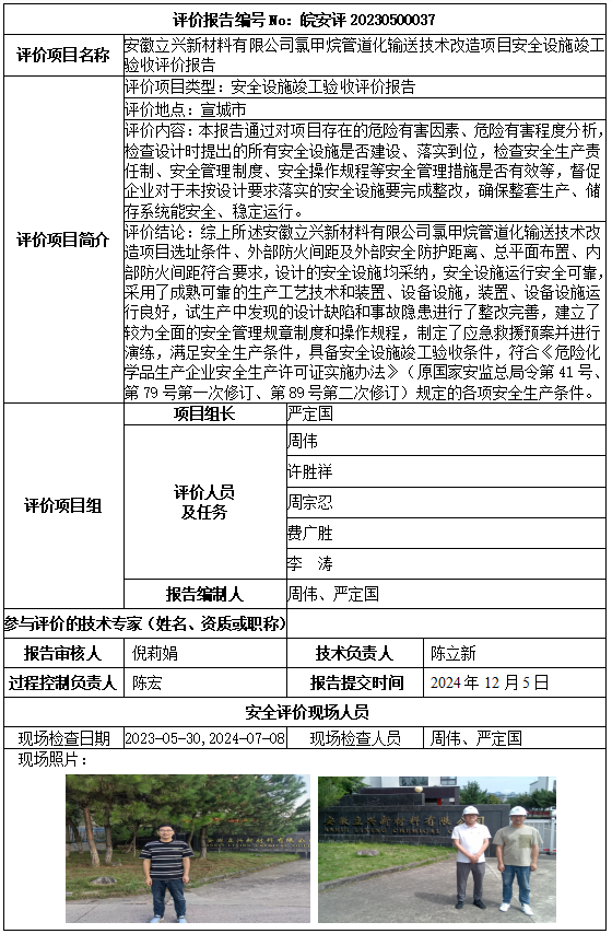 安徽立兴新材料有限公司氯甲烷管道化输送技术改造项目安全设施竣工验收评价报告