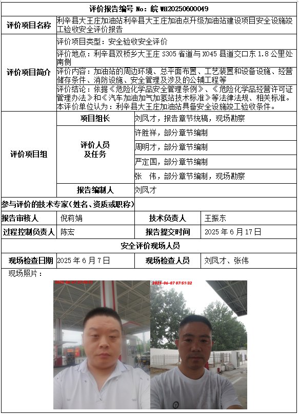 利辛县大王庄加油站利辛县大王庄加油点升级加油站建设项目安全设施竣工验收安全评价报告