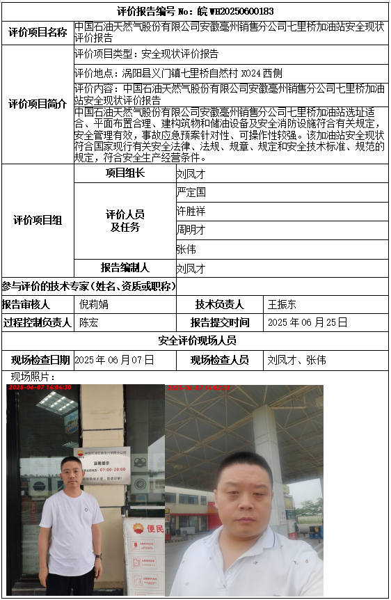中国石油天然气股份有限公司安徽亳州销售分公司七里桥加油站安全现状评价报告