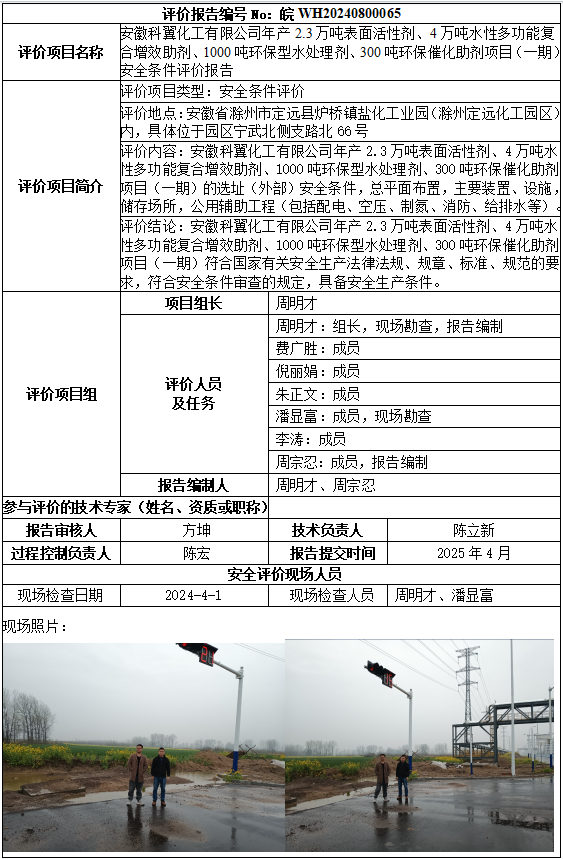 安徽科翼化工有限公司年产2.3万吨表面活性剂、4万吨水性多功能复合增效助剂、1000吨环保型水处理剂、300吨环保催化助剂项目(一期)安全条件评价报告