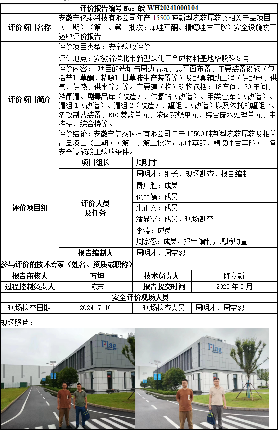 安徽宁亿泰科技有限公司年产15500吨新型农药原药及相关产品项目(二期)(第一、第二批次:苯唑草酮、精噁唑甘草胺)安全设施竣工验收评价报告