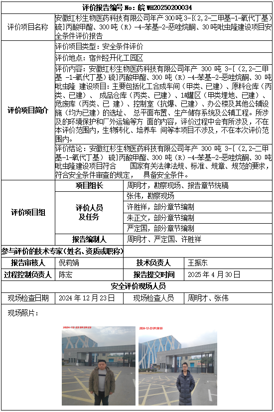 安徽红杉生物医药科技有限公司年产300吨3-[(2,2-二甲基-1-氧代丁基)硫]丙酸甲酯、300吨(R)-4-苯基-2-恶唑烷酮、30吨吡虫隆建设项目安全条件评价报告