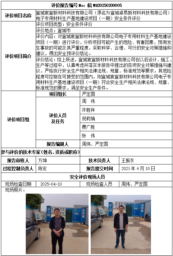 宣城宸宣新材料科技有限公司(原名为宣城卓易新材料科技有限公司)电子专用材料生产基地建设项目(一期)安全条件评价