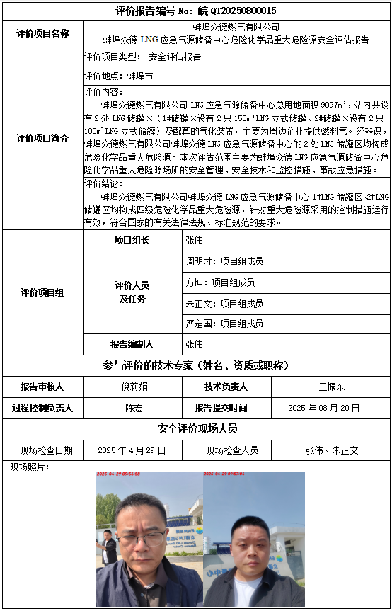 蚌埠众德燃气有限公司蚌埠众德LNG应急气源储备中心危险化学品重大危险源安全评估报告