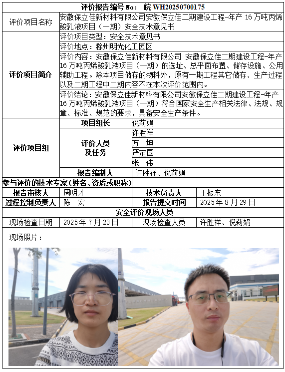 安徽保立佳新材料有限公司安徽保立佳二期建设工程-年产16万吨丙烯酸乳液项目(一期)安全技术意见书