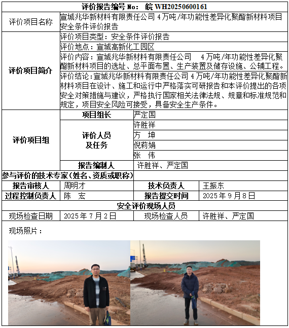 宣城兆华新材料有限责任公司4万吨/年功能性差异化聚酯新材料项目 安全条件评价报告