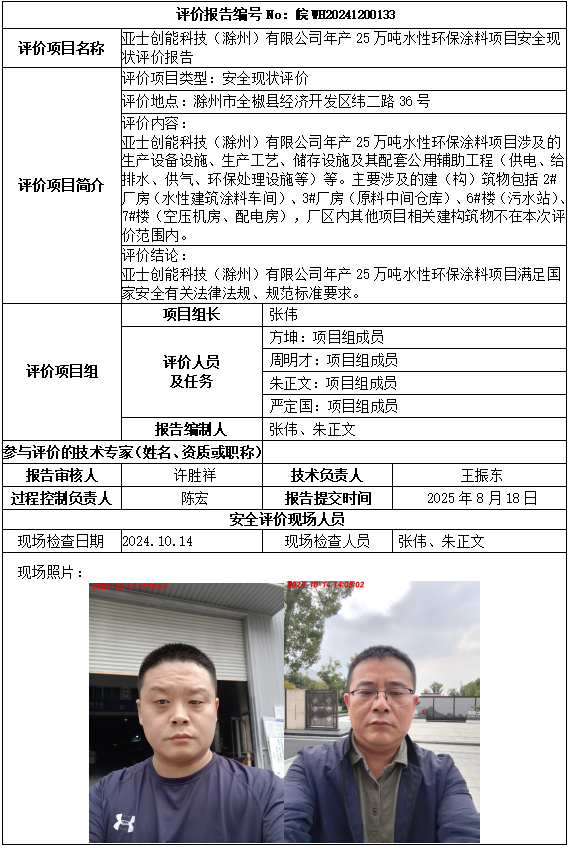 亚士创能科技(滁州)有限公司年产25万吨水性环保涂料项目安全现状评价报告