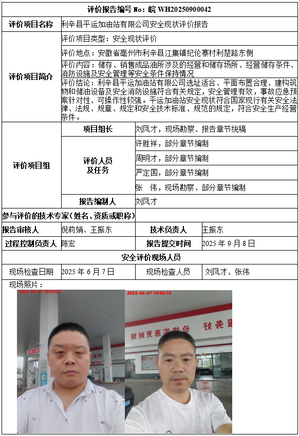 利辛县平运加油站有限公司安全现状评价报告