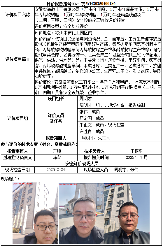 安徽省海徽化工有限公司7万吨/年甲醛、1万吨/年氨基树脂、1万吨/年丙烯酸树脂、1万吨/年醇酸树脂、1万吨/年亚硝基硫酸项目 (二期、三期、四期)安全设施竣工验收评价报告