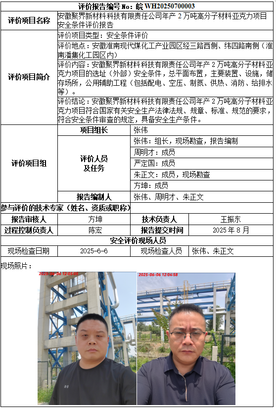 安徽聚界新材料科技有限责任公司年产2万吨高分子材料亚克力项目 安全条件评价报告
