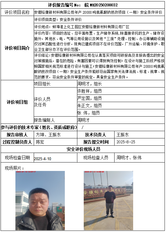 安徽裕康新材料有限公司年产20000吨肌氨酸钠技改项目(一期)安全条件评价