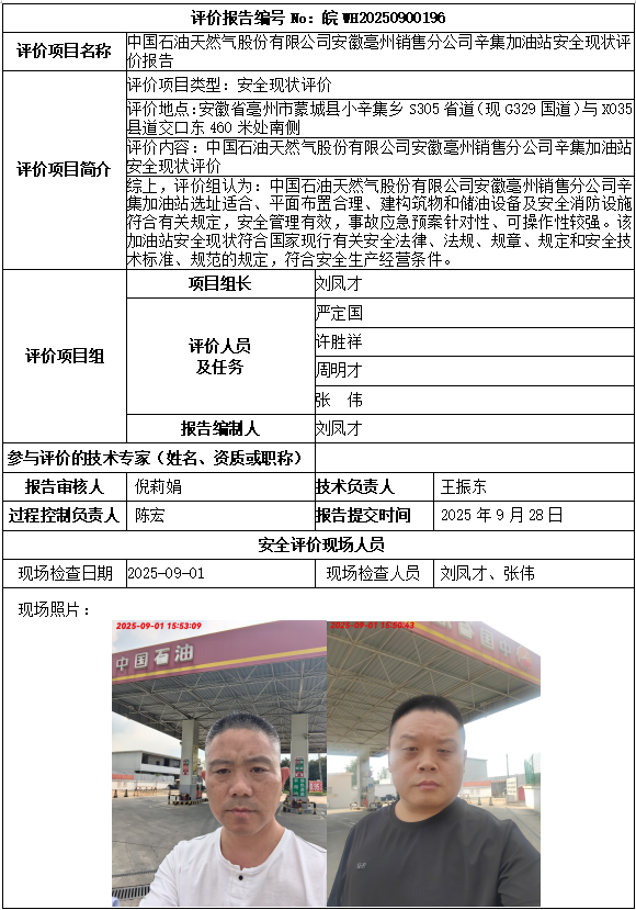 中国石油天然气股份有限公司安徽亳州销售分公司辛集加油站安全现状评价报告
