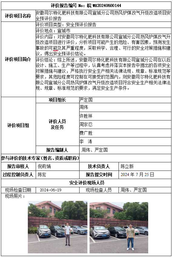 安徽司尔特化肥科技有限公司宣城分公司热风炉煤改气升级改造项目安全预评价报告