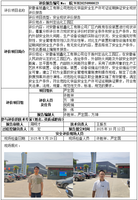 安徽省旭鑫化工有限公司危险化学品安全生产许可证延期换证安全现状评价报告