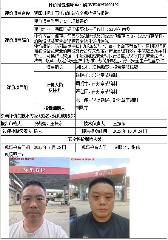 涡阳县标里石化加油站安全现状评价报告