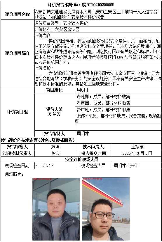 六安新城交通建设发展有限公司六安市金安区三十铺镇一元大道综合能源站(加油部分)安全验收评价报告