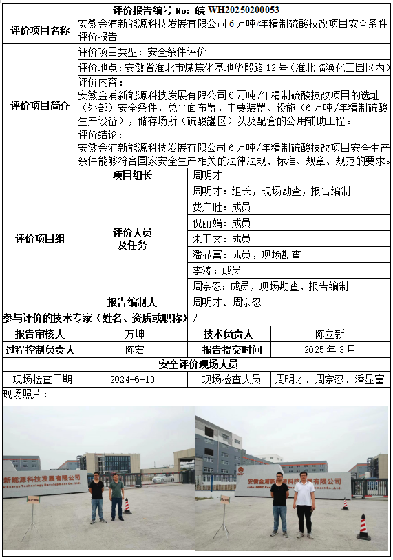 安徽金浦新能源科技发展有限公司6万吨/年精制硫酸技改项目安全条件评价报告