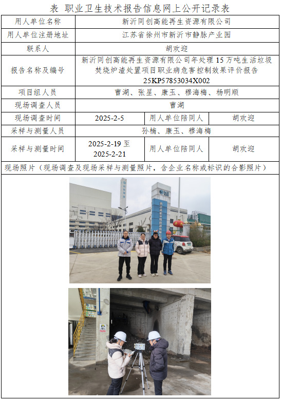 新沂同创高能再生资源有限公司年处理15万吨生活垃圾焚烧炉渣处置项目职业病危害控制效果评价报告