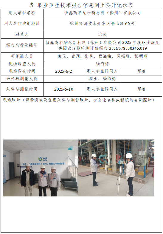 协鑫高科纳米新材料(徐州)有限公司2025年度职业病危害因素定期检测评价报告