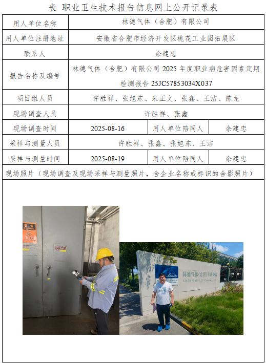 林德气体(合肥)有限公司2025年度职业病危害因素定期检测报告