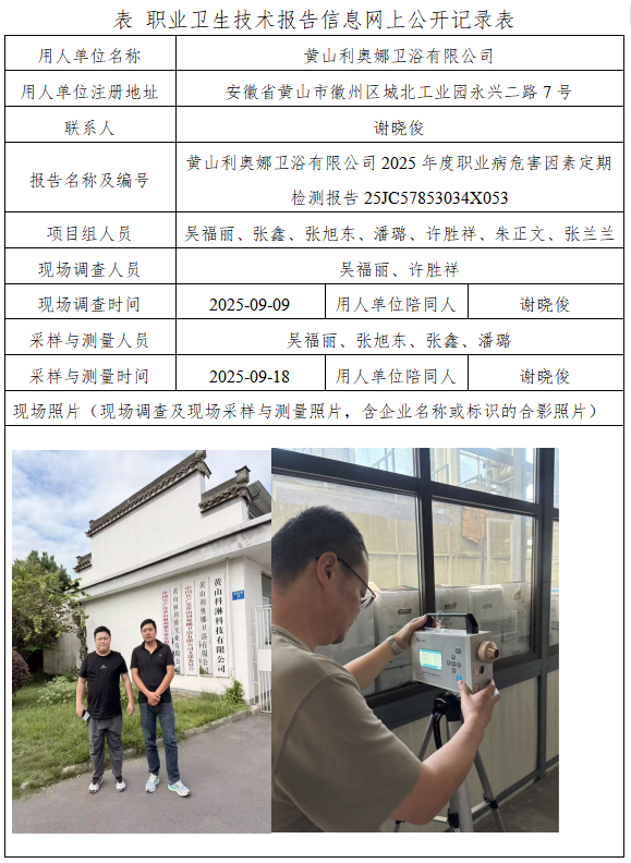 黄山利奥娜卫浴有限公司2025年度职业病危害因素定期检测报告