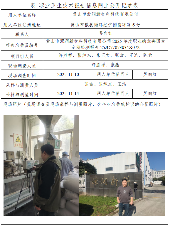 黄山市源润新材料科技有限公司2025年度职业病危害因素定期检测报告