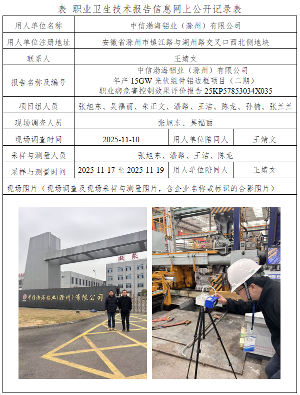 中信渤海铝业(滁州)有限公司 年产15GW光伏组件铝边框项目(二期) 职业病危害控制效果评价报告