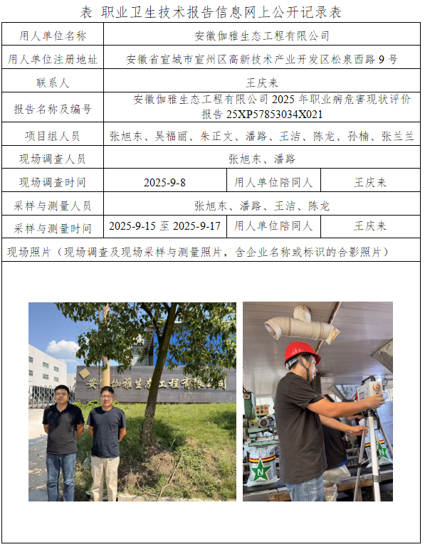 安徽伽雅生态工程有限公司2025年职业病危害现状评价报告