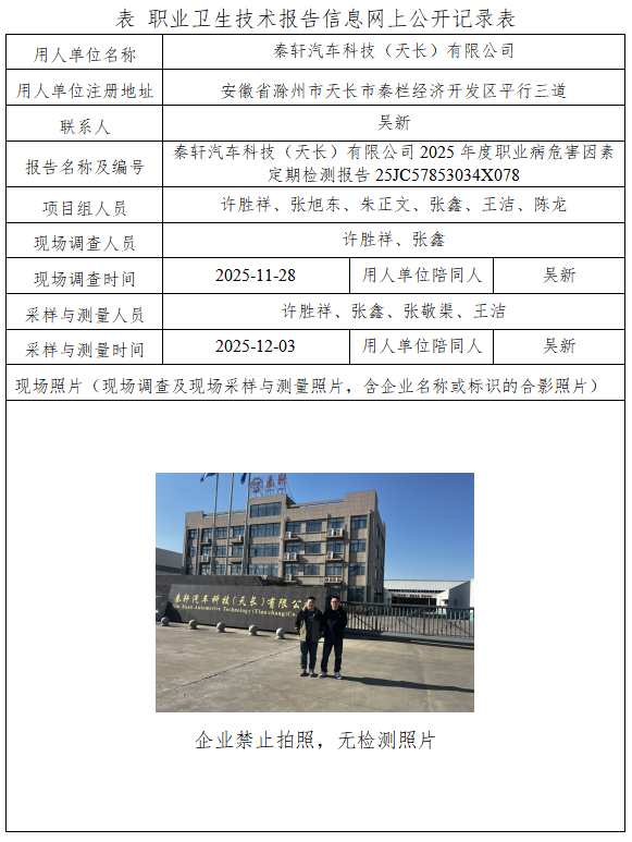 秦轩汽车科技(天长)有限公司2025年度职业病危害因素定期检测报告