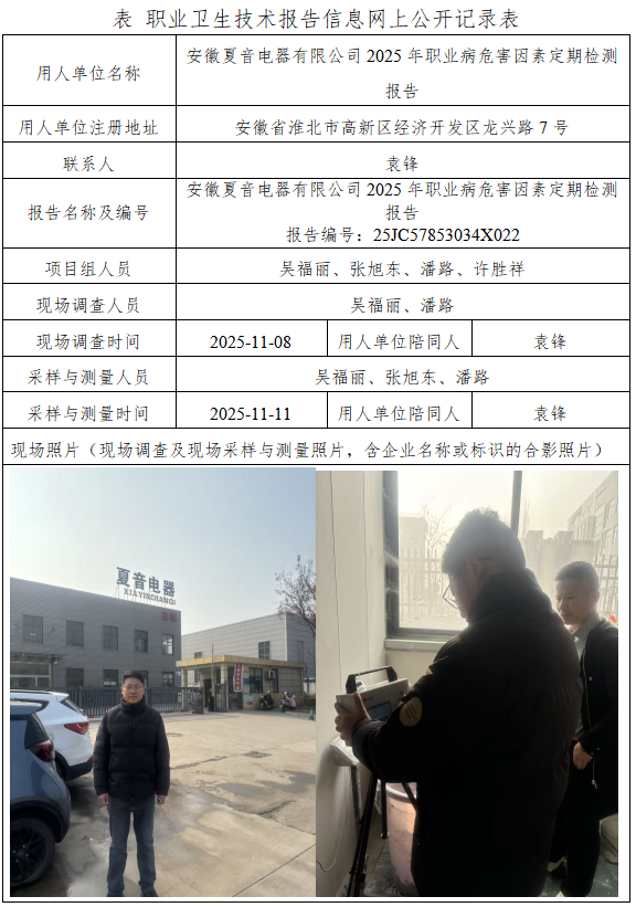 安徽夏音电器有限公司2025年职业病危害因素定期检测报告