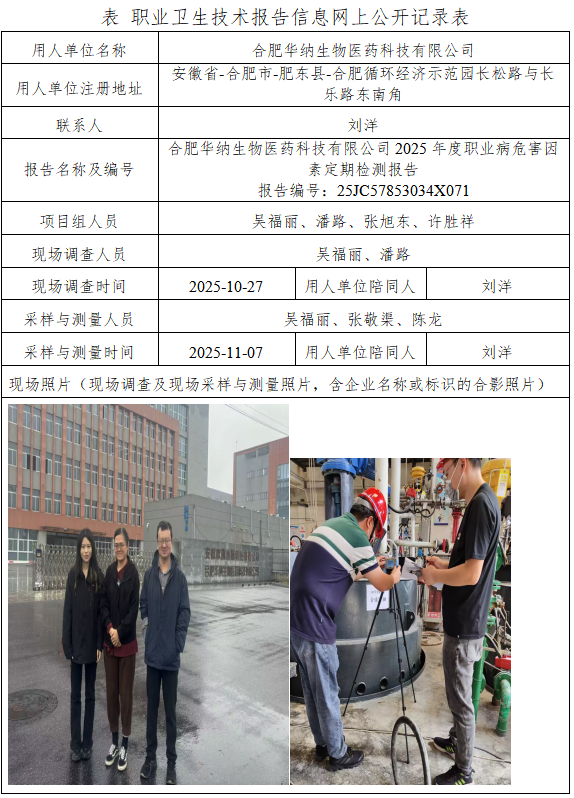合肥华纳生物医药科技有限公司2025年度职业病危害因素定期检测报告