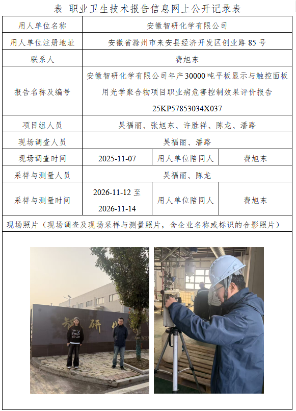 安徽智研化学有限公司年产30000吨平板显示与触控面板用光学聚合物项目职业病危害控制效果评价报告