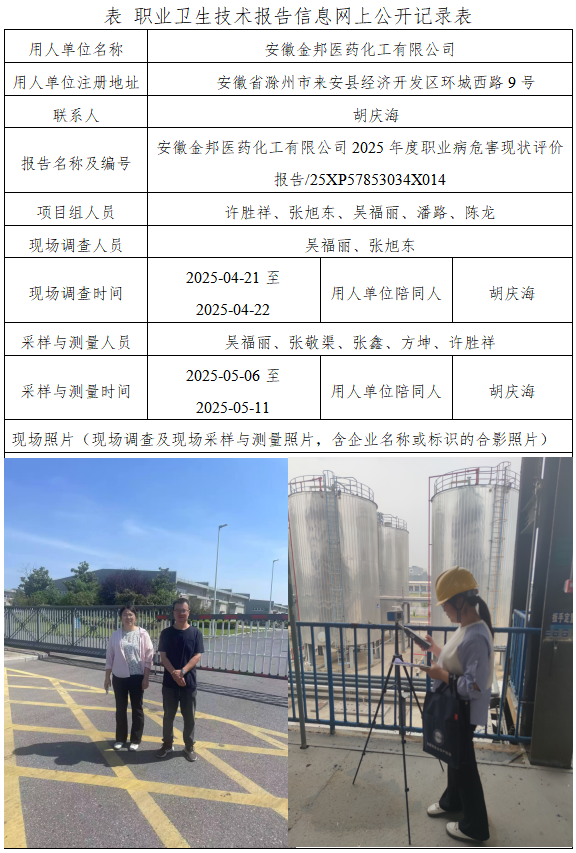 安徽金邦医药化工有限公司2025年度职业病危害现状评价报告