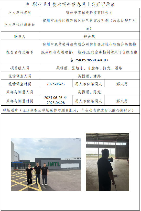 宿州中农秸美科技有限公司秸秆高活性生物酶分离植物组分综合利用项目(一期)职业病危害控制效果评价报告