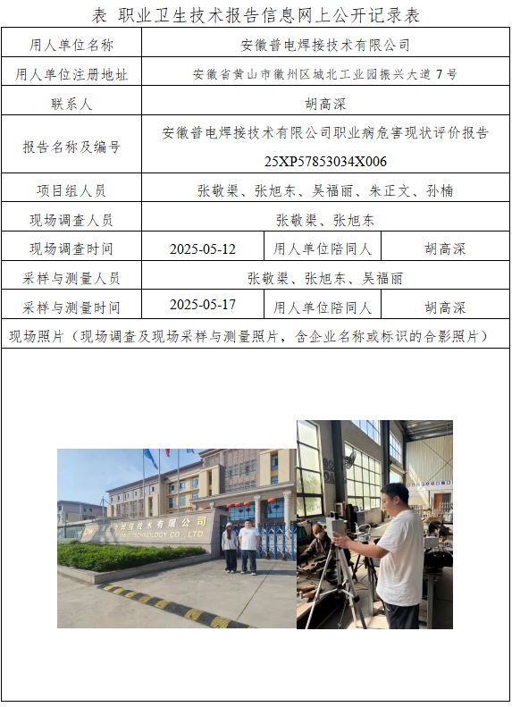 安徽普电焊接技术有限公司职业病危害现状评价报告