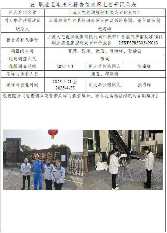 上海大屯能源股份有限公司铝板带厂铝废料炉前处理项目职业病危害控制效果评价报告