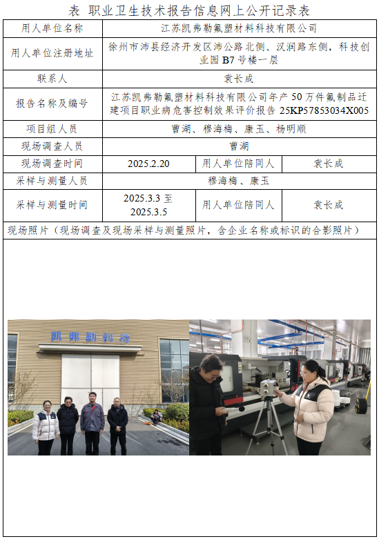 江苏凯弗勒氟塑材料科技有限公司年产50万件氟制品迁建项目职业病危害控制效果评价报告
