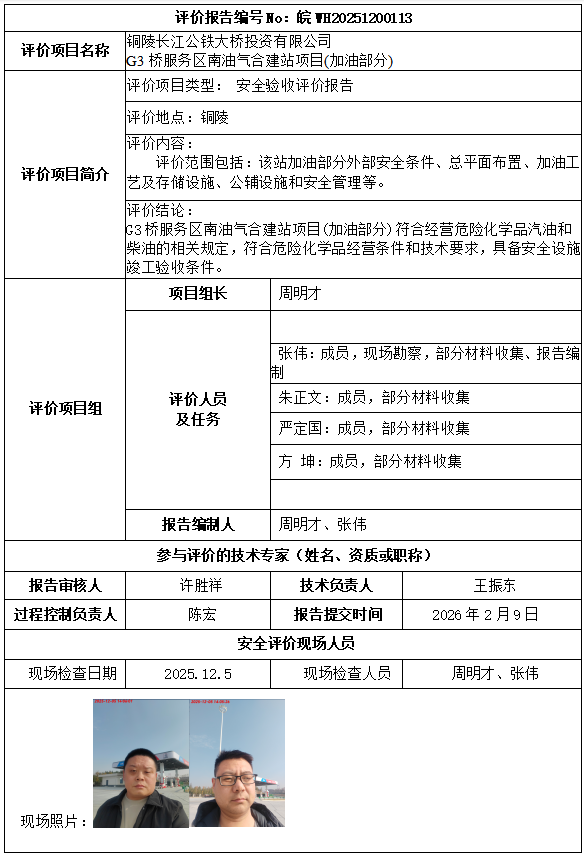 铜陵长江公铁大桥投资有限公司 G3桥服务区南油气合建站项目(加油部分)安全验收评价报告