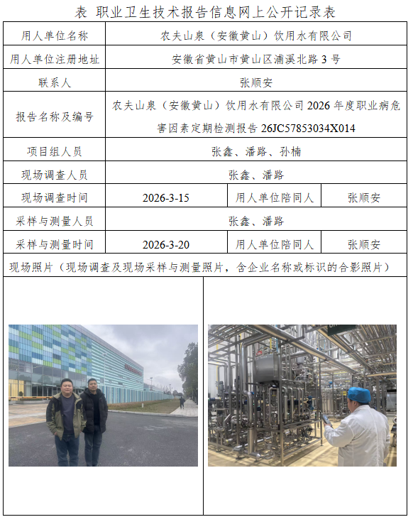农夫山泉(安徽黄山)饮用水有限公司2026年度职业病危害因素定期检测报告
