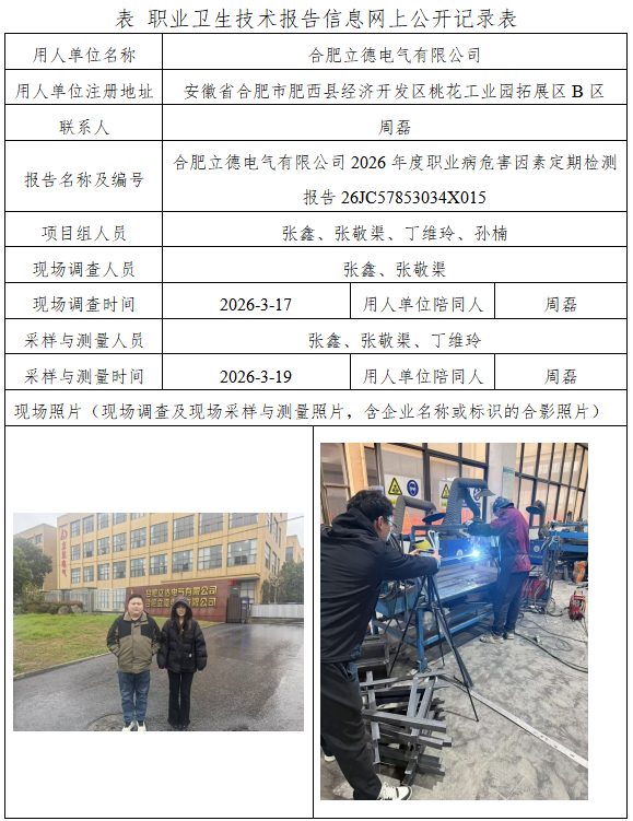 合肥立德电气有限公司2026年度职业病危害因素定期检测报告