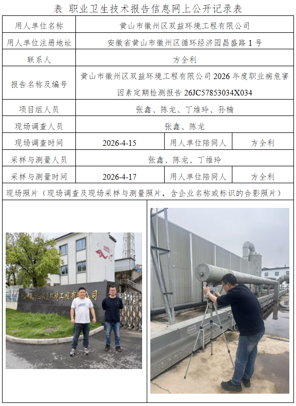 黄山市徽州区双益环境工程有限公司2026年度职业病危害因素定期检测报告