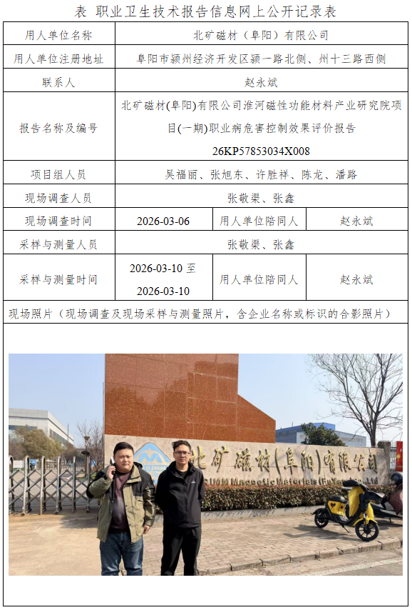 北矿磁材(阜阳)有限公司淮河磁性功能材料产业研究院项目(一期)职业病危害控制效果评价报告