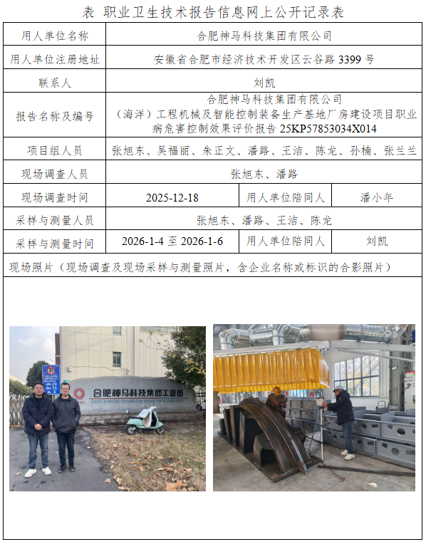 合肥神马科技集团有限公司 (海洋)工程机械及智能控制装备生产基地厂房建设项目职业病危害控制效果评价报告