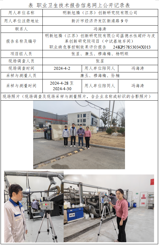 明新旭腾(江苏)创新研究院有限公司温德水性超纤与皮革创新研究院项目(中试基地车间) 职业病危害控制效果评价报告